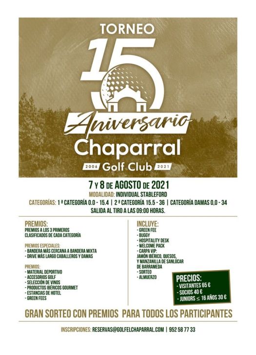 Hola a tod@s. Os dejamos más abajo el cartel del torneo del 15 aniversario del Chaparral por si alguno de vosotros quereis participar ya que nos han pedido que lo difundamos .La inscripción lo teneis que hacer directamente con ellos comentandoles que sois socios del Club de Golf de La Cala de Mijas para que os hagan un precio de 60 € .